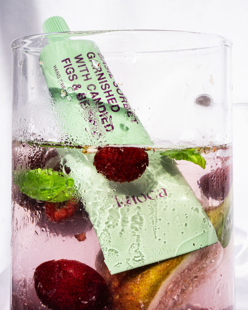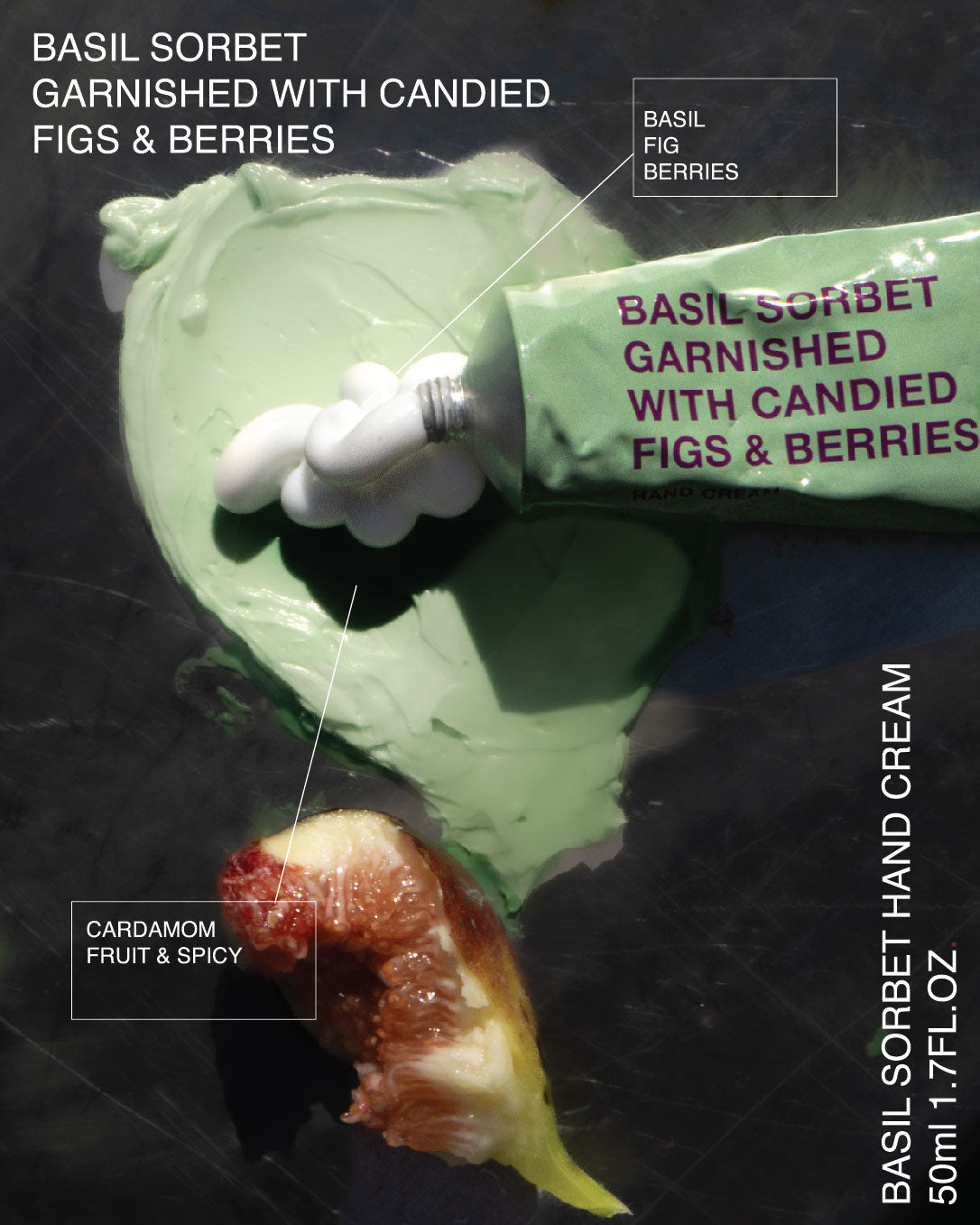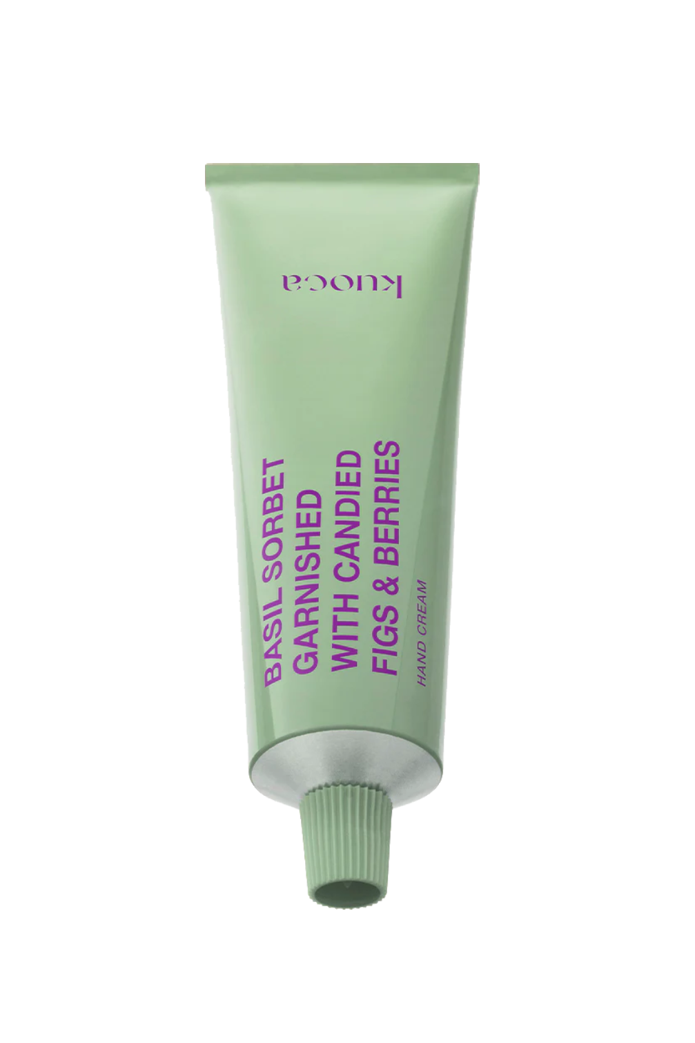 KUOCA Basil Sorbet Garnished with Candied Figs & Barries Hand Cream
