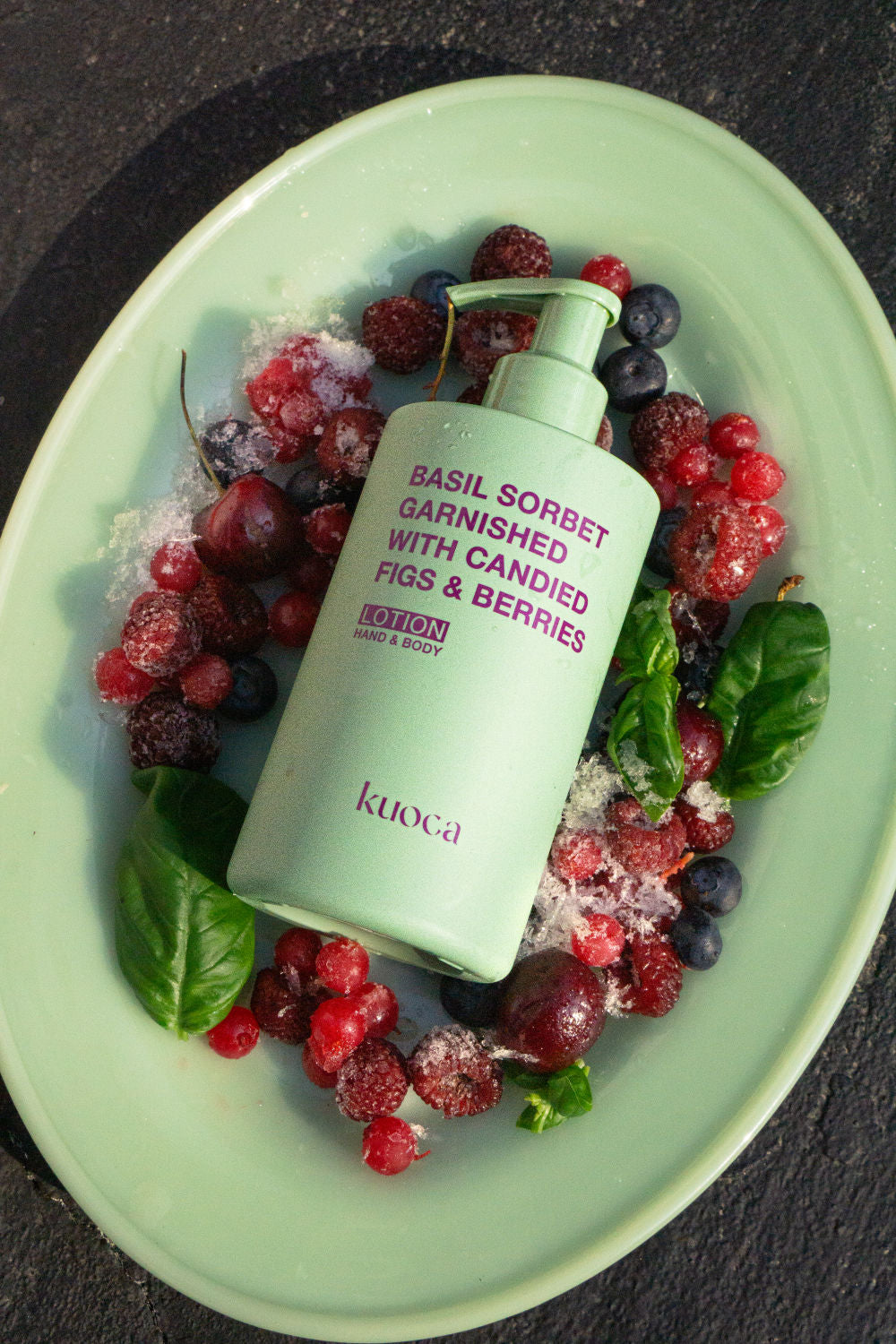 KUOCA Basil Sorbet Garnished with Candied Figs & Barries Hand & Body Lotion